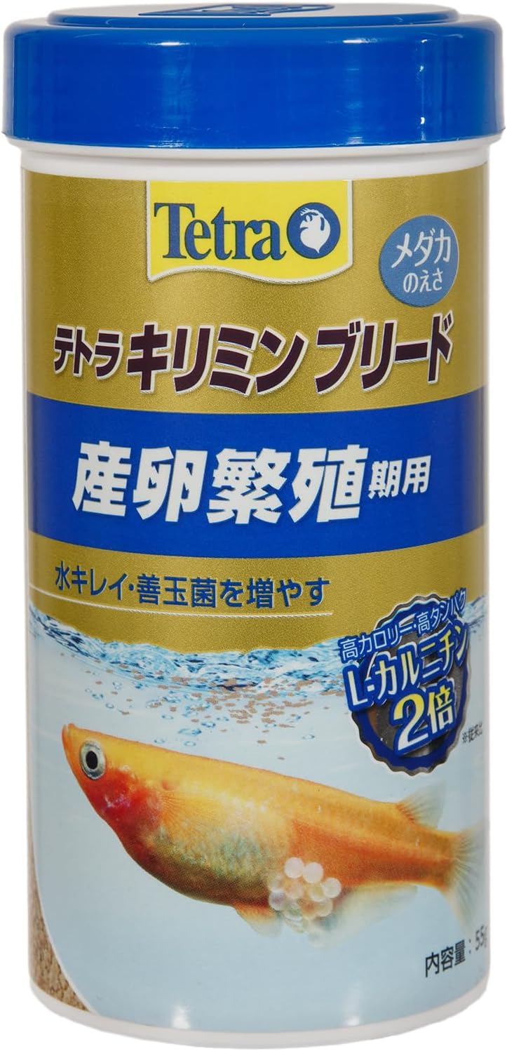 テトラ「キリミンブリード」は、フレークタイプの餌で、凄まじい繁殖作用があることで知られています。この餌を与えると、メダカが狂ったように卵を産み始めることがあるほど、強力な繁殖促進効果があります。